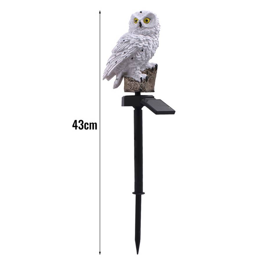 Specifications: Color: White/Brown Material: ABS + PC. Owl statue: 15cm hight. Total:43cm hight. Waterproof: Support. Solar Panel: 1.2V/600mah Light Color: Warm White Auto on at night and auto off at sunrise.