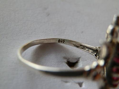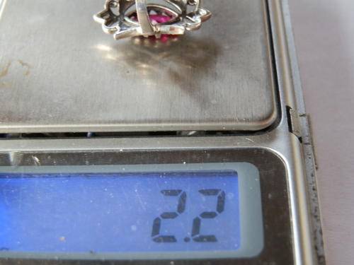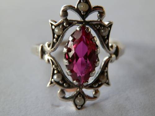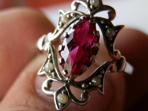 Fabulous sterling silver ruby and seed pearl ring, marked 925, size O / 7.5 with a head width of 20 mm and weight of 2.2 g. The size of the ruby is 5 x 10 mm and tests positive for ruby.