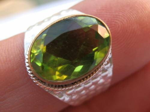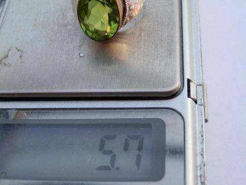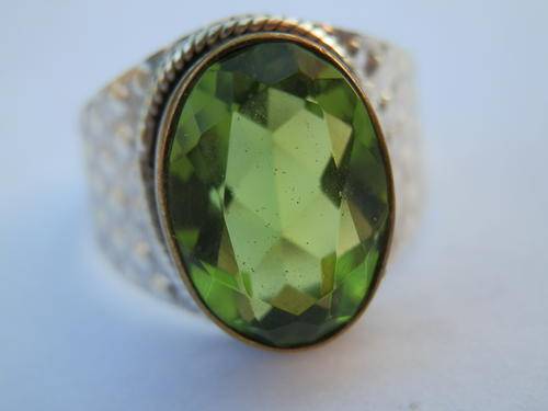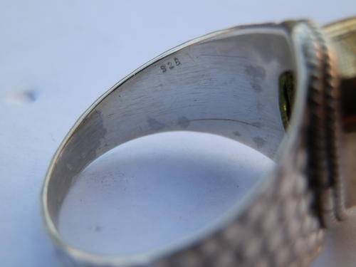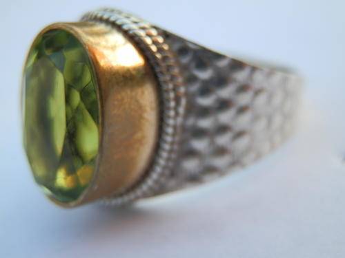Lovely sterling silver 6 ct peridot ring with brass accent, marked 925, size R / 9 with a head width of 16 mm and weight of 5.7 g. The size of the peridot is 10 x 14 mm.