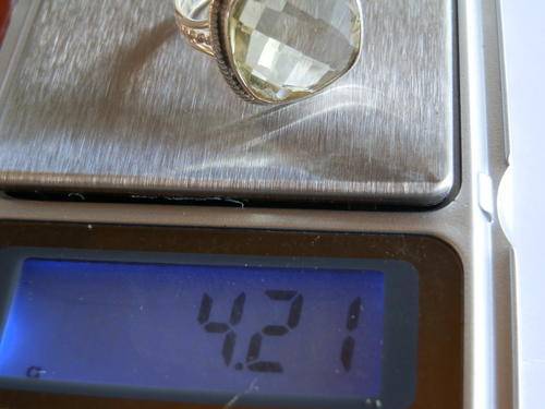 Beautiful sterling silver topaz ring, marked 936 for silver content, the style of the ring is simple and plain, the stone a lemon topaz, 14 x 14 mm in size and a soft yellow-green color, the ring so comfortable to wear, very lovely. The ring size is M+ / 6.5+ with a head width of 16 mm and weight of 4.21 g.