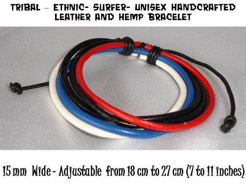 New Tribal-Ethnic-Surfer-Handcraft-Leather and Red, White & Blue Hemp Cuff Bracelet