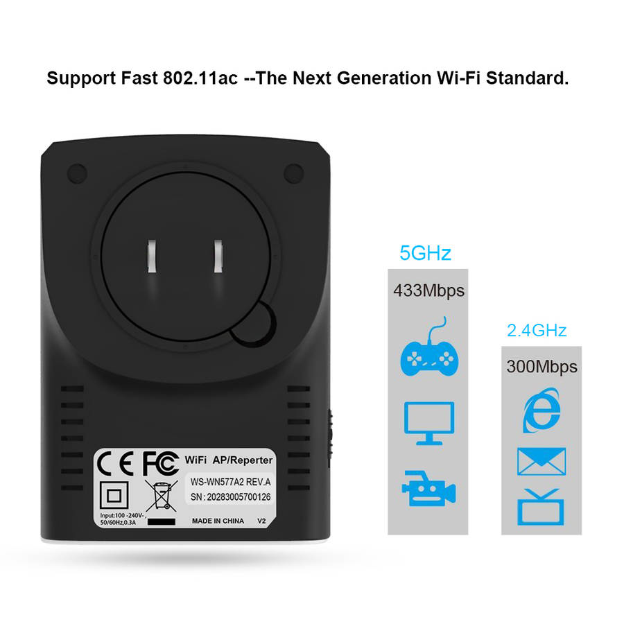 9. Interface: 2* Lan port + WPS/ reset button+ AP/ repeater button+ on/off button 10. Power plug: UK EU US 11. Chipset: MT7628AN+MT7610E 12. Safely: WDS Wifi Repeater 750mbps 13. SDRAM: 512Mb 14. Distance: Outdoors 300m, Indoor 100m 15. Rated voltage: 100-240V 16. Frequency: 50/ 60Hz 17. Power Supply: internal DC5V/1A