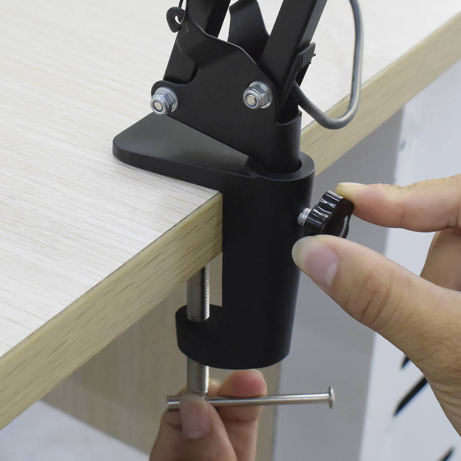 1. The durable metal clip can be fixed to any flat surface that is less than 2.56 ``/ 6.5 cm (max) thick. It saves space, conveniently attaches to a desk, workbench.