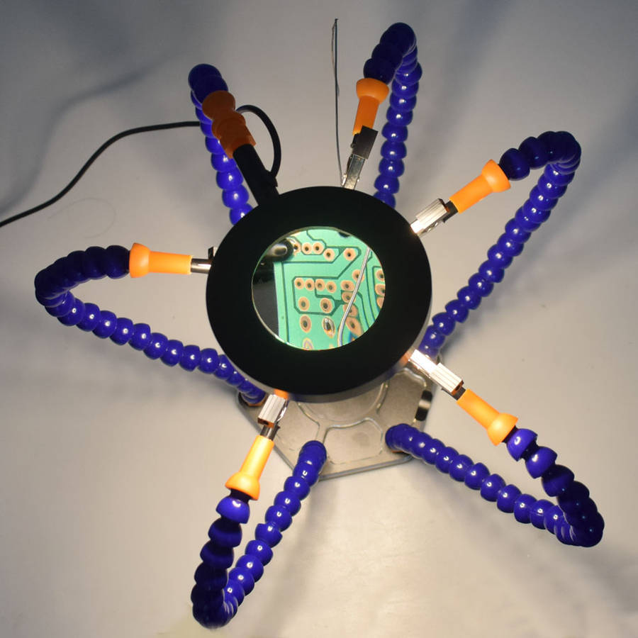 Feature: 1. Six small flexible arms helping hands are easily positioned where you want them. Eliminates the frustration of traditional helping hands. 2. Metal plate can keep the QuadHands from sliding around on your bench. 3. Silicon alligator clip tips for the ultimate heat resistance. 4. USB 3X Magnifying Glass can help you do better job.Magnifying glass with LED light, the color temperature of LED light can be adjusted in 3 steps and the brightness can be adjusted in 11 steps, it can meet various working environments. 5. Very suitable for the complex difficulty welding such as model airplane repair, easy to clamp the solder and operation. Specification: Lens Diameter: 60mm Magnification: 3X LED: 42 SMD LED Lights Charge: Under 5V 1.5A USB Type: USB Cable Aluminum Alloy Base: 24cm x 18cm Universal Joint Pipe Length: 300 mm/400mm Universal Tube Material: Plastic Aluminum Alloy Base Color: Black Packing Weight: 0.6kg Package included: 1 x Aluminum Alloy Base 1 x USB 3X Magnifying Glass 1 x Mini Wrench 5 x Alligator Clips 6 x Universal Joint Pipe(300mm/400mm) Detail Pictures: