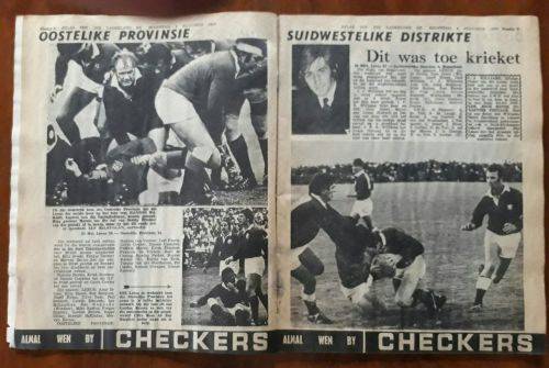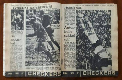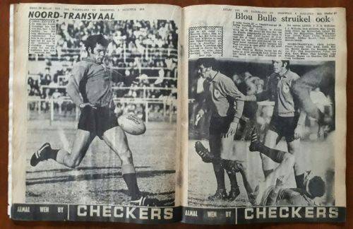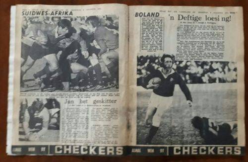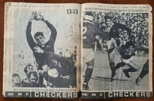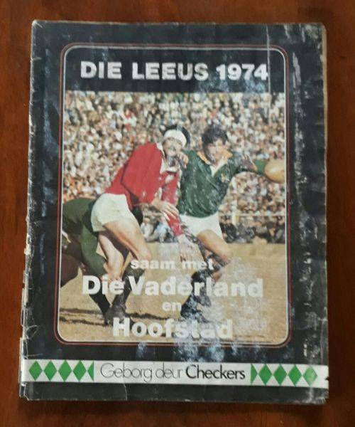 Below : Souvenir rugby magazine (supplement to the 'Vaderland' and 'Hoofstad' newspapers of 1974) containing pictures and reports on all the matches played by the 1974 British Lions in South Africa. Some coloring and creasing - but still in a good condition for its age. Size : 265mm x 210mm. 54 Pages. See pictures below for some of the content and condition of the magazine