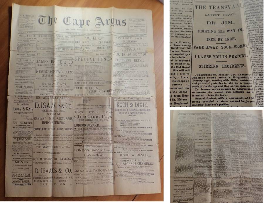 This Argus newspaper of 2 January1896 is in fine for its age condition. It reports on the ill-fated Jameson raid.