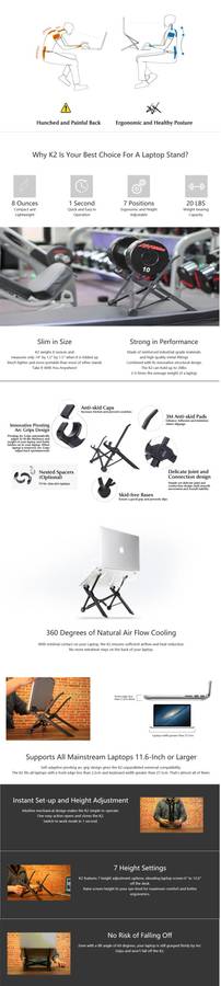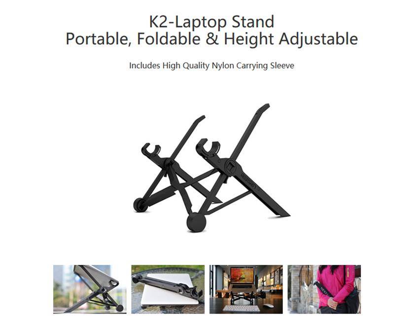 NexStand K2 Laptop Stand is an ultra portable, super lightweight laptop stand that transforms your laptop into an ergonomic desktop workstation. Height Adjustable - From 6 to 12 inch of lift. Easy to Use, Compact and Portable - Take it with you everywhere! Fits almost All Makes/Models of Laptops Incredibly light (5.8oz) and fully collapsible. Comes with High Quality Nylon Carrying Sleeve Makes a perfect gift for techies, students, or any frequent laptop user.
