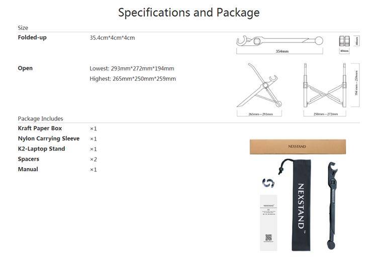 1 x NEXSTAND K2 Laptop Stand 1 x Nylon Carring Sleeve 1 x Kraft Paper Box 2 x Spacers 1 x Manual