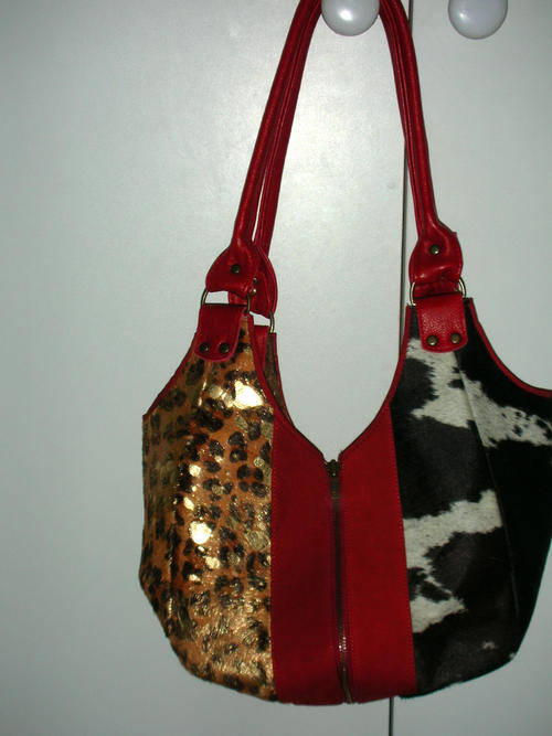 Highly unusual large handbag made from black and white Nguni hide, gold embossed leopard print Nguni, red suede and lined at the top inside with bronze ostrich leather. A zip opens up around the outside to make the bag larger, red leather shoulder straps complete the look, only used twice! A real show stopper! Postage R40.00, please add 2% of value for optional extra insurance.