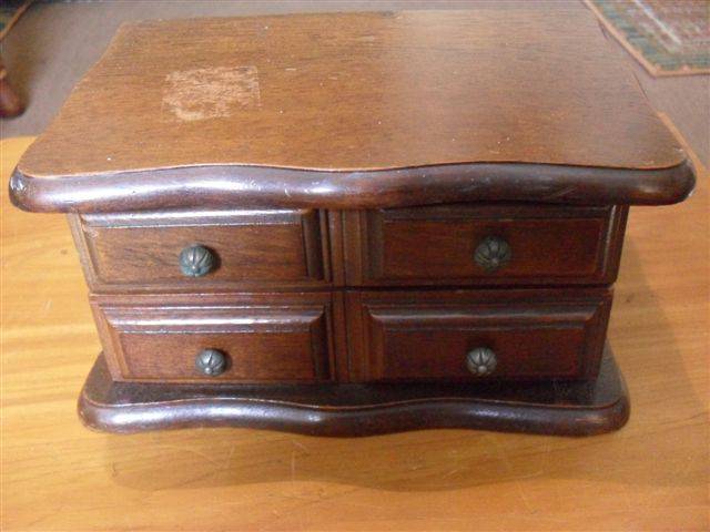 HAS 2 BOTTOM DRAWERS.....HINGED LID OPENS TO A TOP 8 DIVISION COMPARTMENT.....