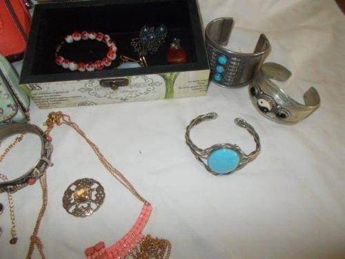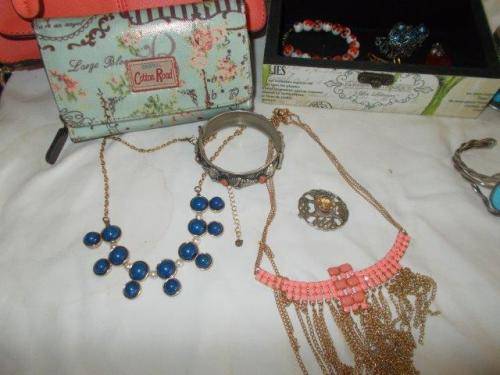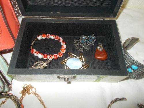 nice goodies all for one bid , one small handbag with purse , trinket box with some nice costume jewelry only one item is damaged the pendant inside the box the stone is damaged other wise all in good used condition