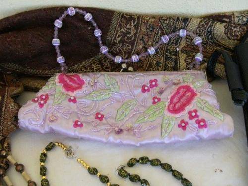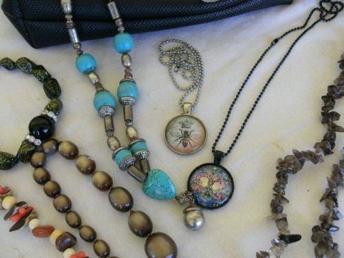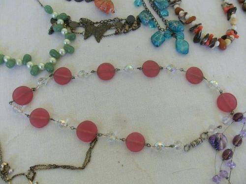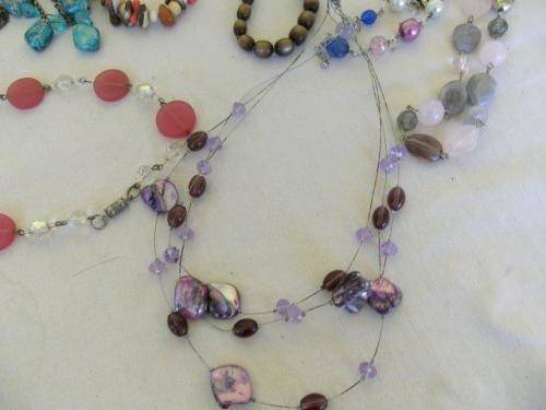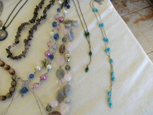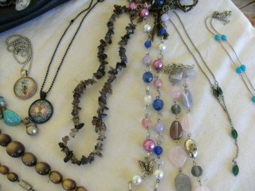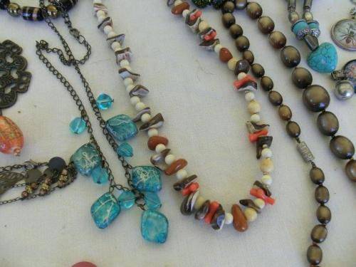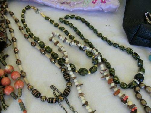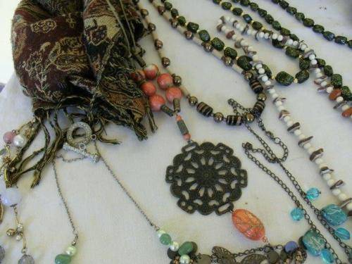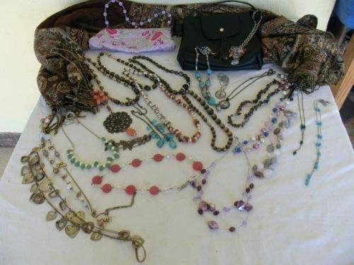 WOW A NICE HUGE LOT OF STUNNING LADIES ITEMS +- 20 ASSORTED PRETTY COSTUME NECLACES AND SOME BROOCHES AND ONE BANGLE TWO BAGS AND ONE PRETTY SHOULDER THROW ALL ITEMS ARE IN GOOD USED CONDITION ALL FOR ONE BID