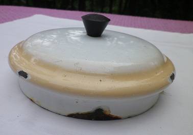 In overall good vintage condition. No holes. A few minor chips to the enamel, and one spot of rust- as indicated in the photos.