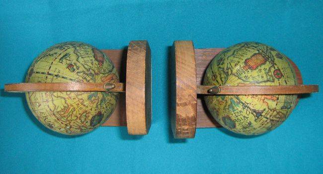 NICE PAIR OF WOODEN WORLD GLOBE BOOK-ENDS.