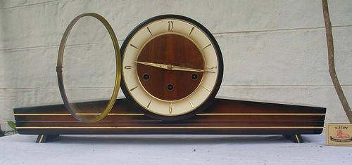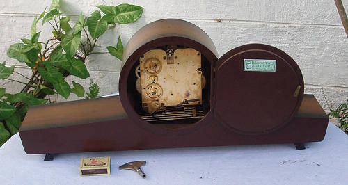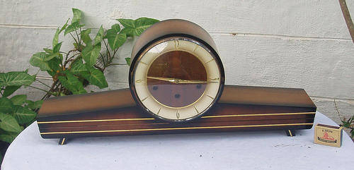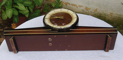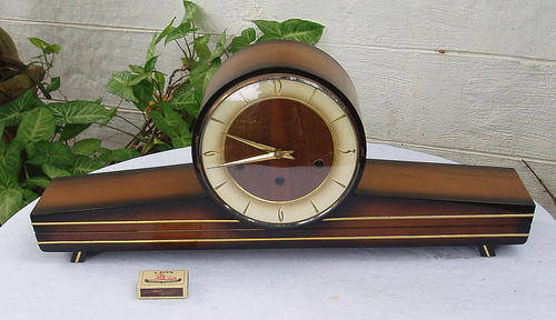 NICE VINTAGE WOOD AND VENEER MANTEL CLOCK WITH WINDING MECHANISM, NO PENDULUM. RECENTLY FULLY SERVICED AND A COG REPLACED ( CLOCK REPAIR LABEL ON THE BACK AND DATE 3/11). THREE KEY FITTINGS FOR A WESTMINSTER CHIME, SOUNDS REALLY AWESOME, WORKED FOR A FULL 7 DAYS AFTER COLLECTION.... FULLY WOUND AT THE CLOCK SHOP.....CHIMES ON THE 1/4 HOUR AND FULL CHIME ON THE HOUR, FOLLOWED BY TIME OF DAY CHIMES. UNFORTUNATELY THE CLOCK IS WITHOUT ORIGINAL KEY......A SPARE KEY USED BY CLOCK MAN TO WIND CLOCK AND I HAVE A SPARE KEY WHICH DOESN'T FIT 100% SO WILL TRY AND BUY A FITTING KEY BEFORE AUCTION CLOSE. CLOCK MEASURES APPROXIMATELY 56 X 22 X 12CM. CASING IN EXCELLENT CONDITION, THE ONLY ISSUE IS A GOLD SECTION OF STRIP BEADING LACKING FROM THE CENTRE STRIP, NOT DETRACTING FROM THE APPEAL. NO MAKERS NAMES OR LABELS SEEN ON THE WORKING PARTS OR CLOCK.