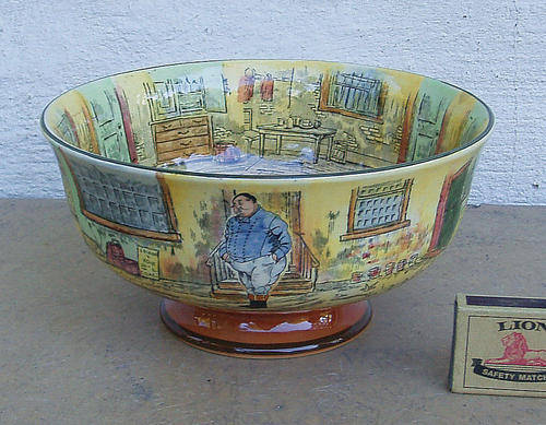 LOVELY VINTAGE ROYAL DOULTON DICKENS WARE BOWL WITH THREE DICKENS CHARACTERS AROUND THE SIDES OUTSIDE AND THE USUAL OLDE WORLDE BUILDINGS TRANSFER PRINT ON THE INNER SIDES. ONE OF THE CHARACTERS IS THE FAT BOY, NOT SURE OF THE OTHER TWO. NICE BRIGHT COLOURS STILL. BOWL IS IN EXCELLENT CONDITION, SOME USUAL LIGHT INVISIBLE GLAZE CRAZING, BUT CAN BE USED FOR FRUIT OR POU POURRI. NO CRACKS, CHIPS OR REPAIRS TO THIS. SEE MORE VINTAGE ROYAL DOULTON DICKENS WARES LISTED.