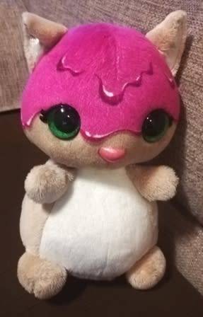 This cuddly toy cat has soft beige plush fur, a white tummy, and a big purple splodge of sirup on its head.
