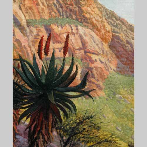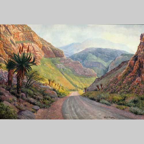 | DESCRIPTION | A beautiful and striking original oil painting of A MOUNTAIN PASS. Painted by South African artist Nick Meyer. The painting is done on artist board (fine treated canvass on hardboard) and it is framed in a good quality wooden frame with inner frame. The artist has signed the artwork at bottom right and also dated it (20)00. This is a large artwork which measures 680 x 930 mm in the frame and the artwork alone measures 500 x 750 mm. You can see the painting as it is sold in the image above. There are four more images and further particulars below. Please have a look at them and ask a question if there is anything you are unsure about. |