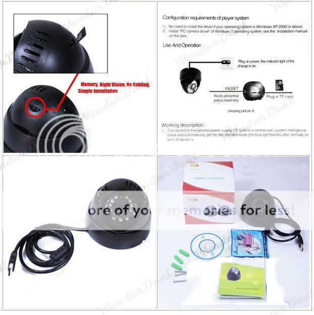 With the latest single chip embedded video monitoring system, this product has the functions of video recording, sound recording, nighttime infrared monitoring, and circulating storage. Compared with tranditional analog surveillance, it has the advantages of easy installation(do not need professional wiring), operation (directly plug in power to start working), and convenience of video data reading (all video files are named by the exact time), and so on. It is widely used in households, businesses, offices, supermarkets, schools, warehouses, shops, garages and the facades of buildings, streets and other places that need monitoring.