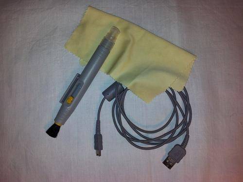 Everything works perfectly. Cleaning brush, microfiber cloth, USB cable.