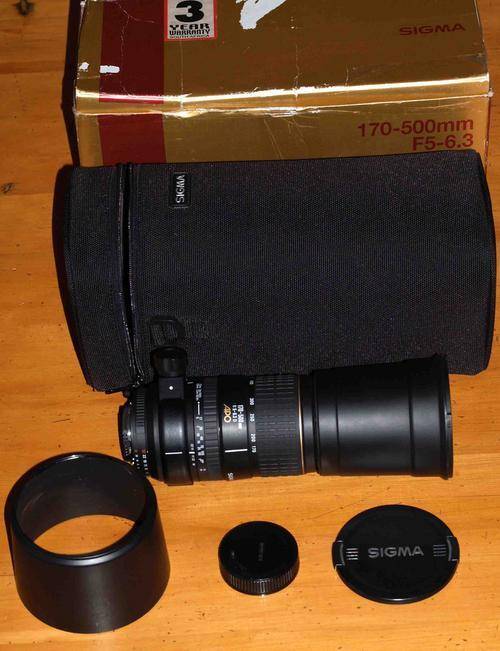 This Nikon-mount Sigma 170-500mm (f5-6.3) APO aspherical RF lens is in immaculate condition. It comes complete with lens hood, front and back caps, carry bag and original box.