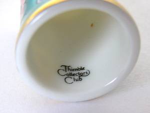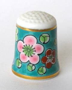 A Nimura Japanese thimble decorated with flowers on an emerald ground and trimmed with two gold bands. It also has the Thimble Collectors Club logo on the inside.