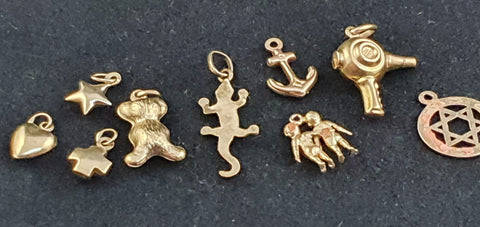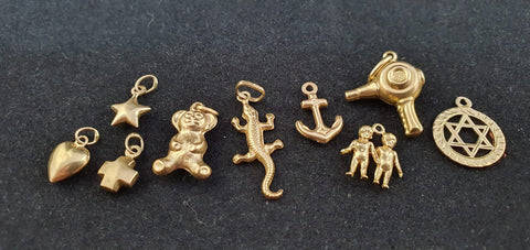 This collection of 9ct gold charms weighs 4.90grams. They are wonderful and include a heart, lizard, star, cross, bear and more. These charms are a lovely gift to add to a bracelet or to start one. Please view the pics as they form part of the description.