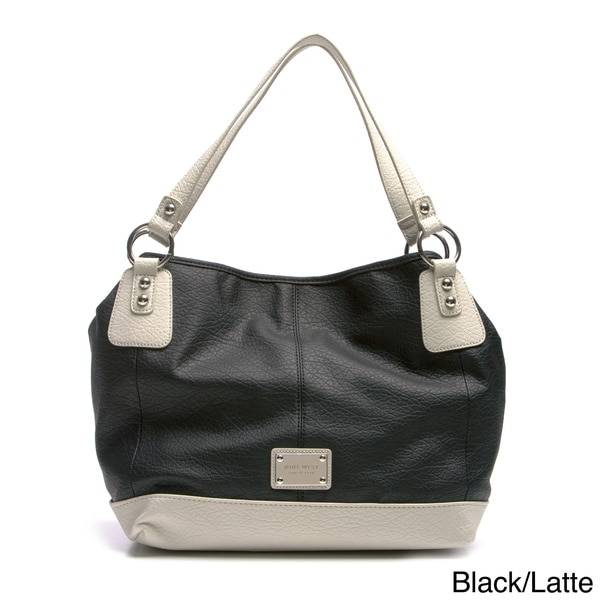 A colorblock design defines this fashionable Blocked Boston shopper- handbag from Nine West. Attractive silvertone hardware; straight handles and an interior pocket finish this handbag.