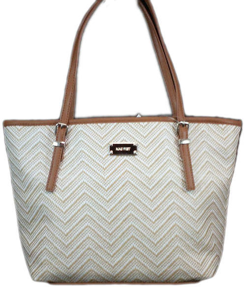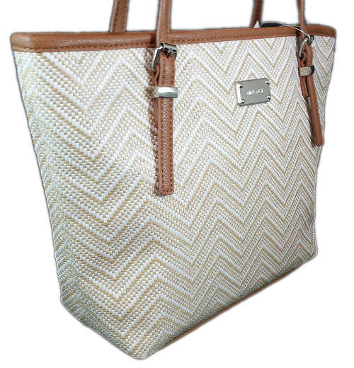 Add a chic finishing statement to complete your look when you choose this It Girl shopper bag from Nine West. The exterior features an intricate two-tone woven chevron patterned shell with contrasting faux leather trim, silver-tone hardware, logo nameplate, and thin shoulder straps with faux buckle detail. The interior features a fun printed fabric lining, 1 zip pocket, 2 slip pockets, and zip top-closure. Dimensions: 25cm L x 9cm W x 23cm H