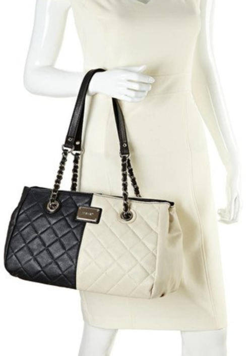 This adorable tote from Nine West is the essential accessory this season to elevate your wardrobe! The faux leather exterior features a unique colour block design accented with an all-over quilted detail, silver-tone hardware, and double chain/faux leather straps with a 10 drop. The interior features a full fabric lining, a zip-close compartment, and 2 media pockets with a zip top-closure.