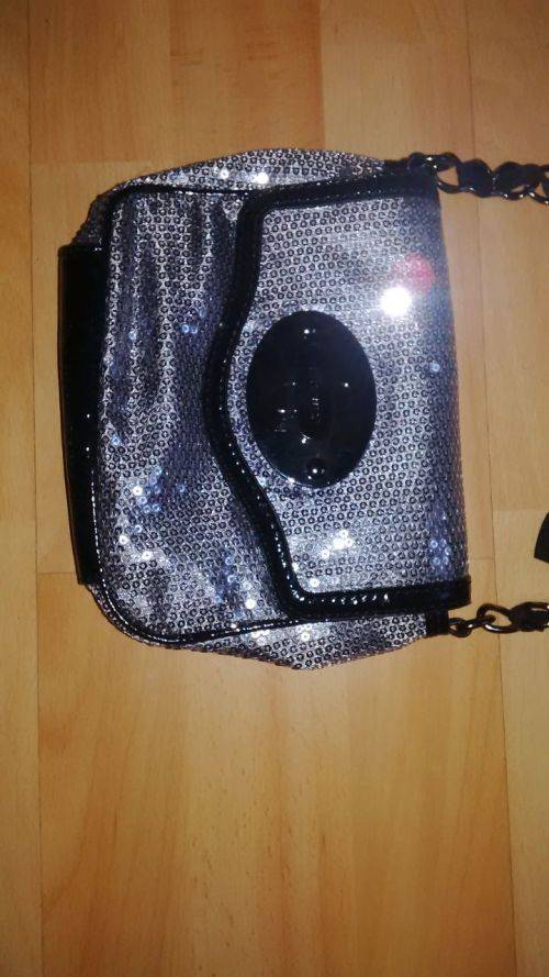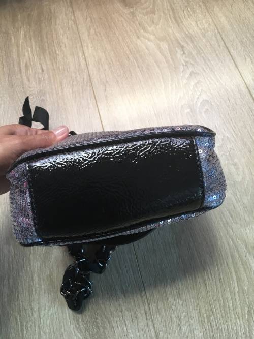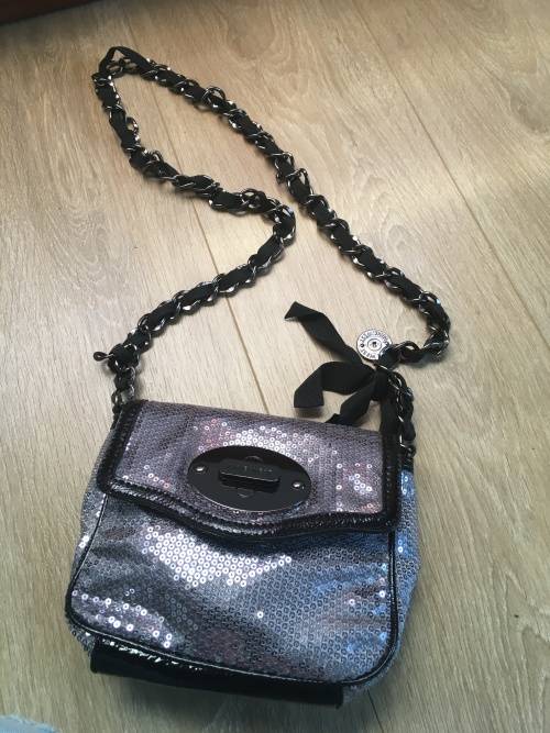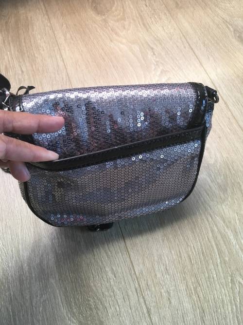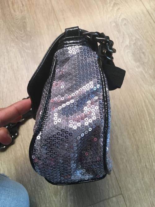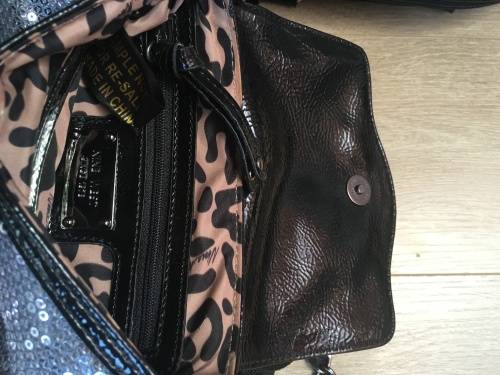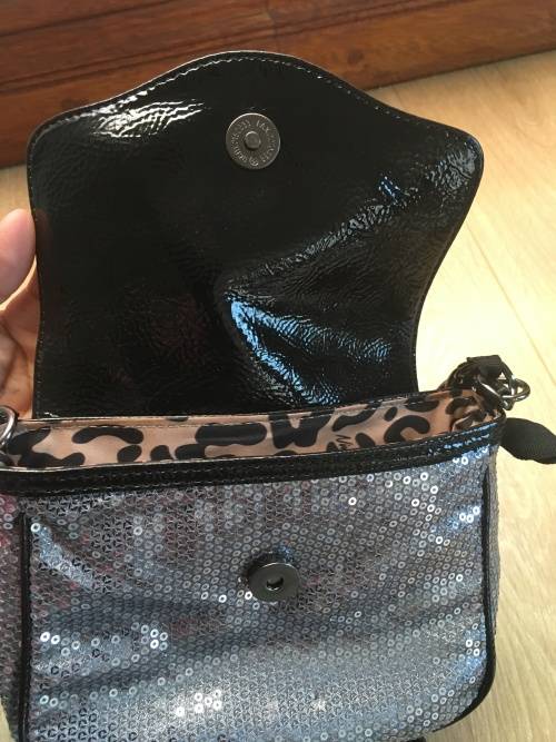 This is a stunning piece silver sequin purse with stunning chain strap/not detachable. The interior has the signature ninewest animal print lining. Please note this was from a sample sale. This item is preowned but has been unused. Its labelled Ninewest sample. The item is Authentic.