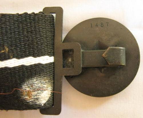 NO. 4842) RECCE REGT. STABLE BELT & BUCKLE NUMBERED. BRASS COMPASS ROSE BUCKLE. BELT: BLACK WITH NARROW WHITE STRIPE. ORIGINAL.