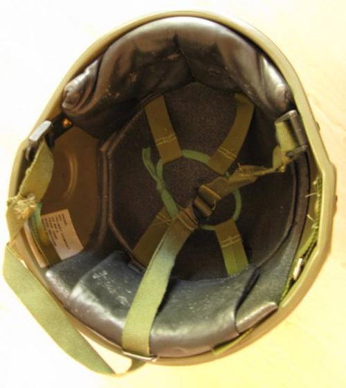 NO. 5735) BRITISH ROYAL MARINE MARK 6 COMBAT HELMET - KEVLAR - SIZE MEDIUM DATED 1986. USED BUT GOOD CONDITION COMPLETE WITH INNER & CHIN STRAP.