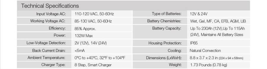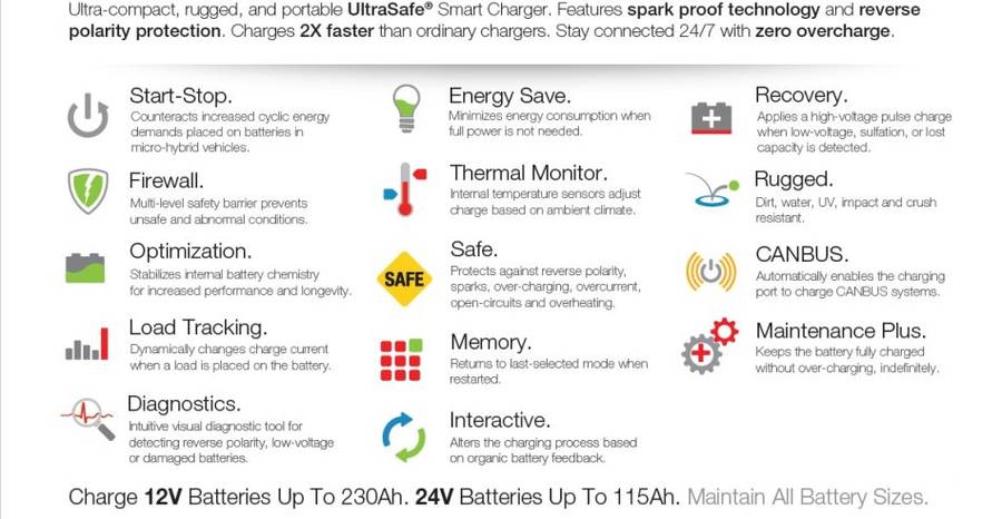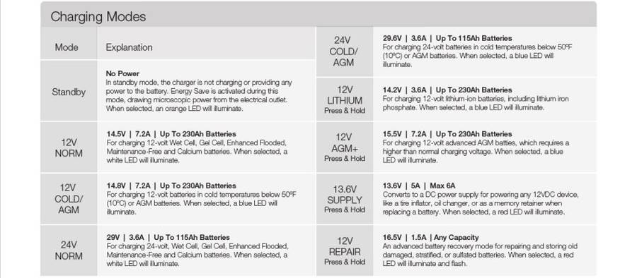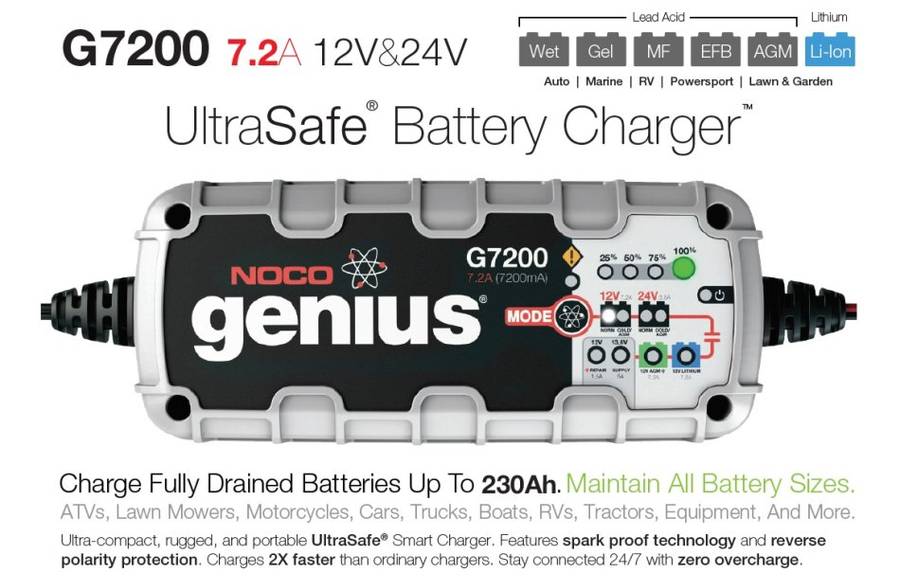 The G7200 is a portable and automatic battery charger. It can be used for both 12V and 24V lead-acid and lithium-ion batteries. The G7200 is designed for charging cars, boats, RVs, SUVs, diesel trucks, motorcycles, ATVs, snowmobiles, personal watercraft, lawn mowers, and much more. It also can be used as a battery maintainer to keep both starter and deep-cycle batteries fully charged. It also monitors battery activity for safe and efficient charging without any overcharge. The G7200 is complete with a built-in battery desulfator in order to rejuvenate under-performing batteries.
