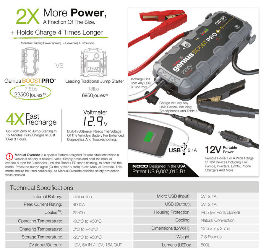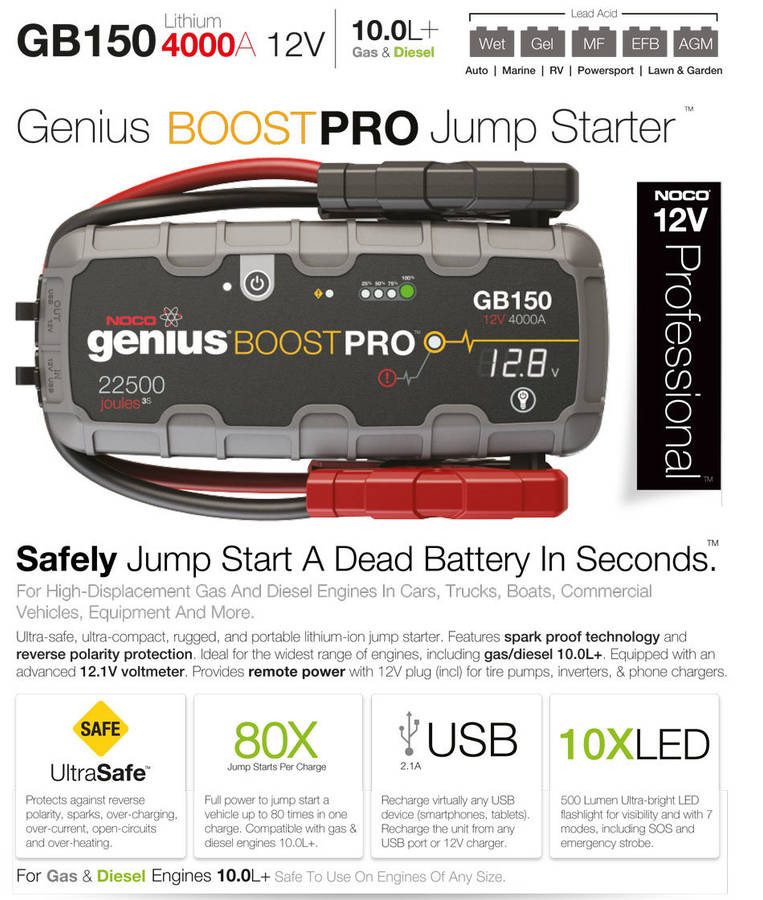 The GB150 is a portable lithium-ion battery jump starter pack that delivers 4,000-amps (22,500 J3S) for jump starting a dead battery in seconds. It features a patented safety technology that provides spark-proof connections and reverse polarity protection making safe and easy for anyone to use. It's a powerful battery booster that doubles as a portable power source for recharging USB devices, like a smartphone, tablet and more, or powering 12-volt devices, like a tire inflator, power inverter and much more. And designed for a car, boat, RV, truck and more with both gas and diesel engines up to 10 litres and more.