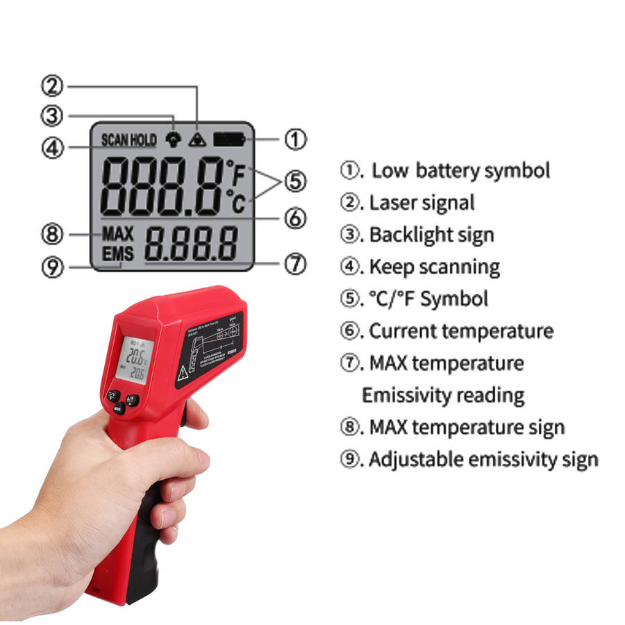 | Product | Non Contact -50~380/550 Laser LCD Display Digital Temperature Thermometer (Type A) |