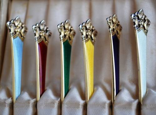 A stunning set of six demitasse spoons, each with a different colour enamel inlay
