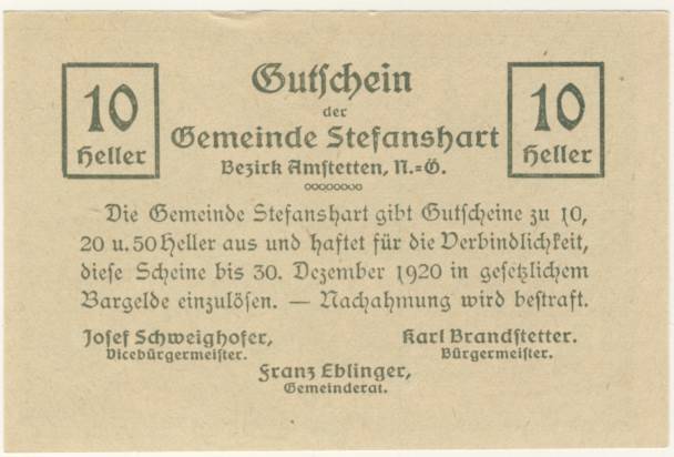Notgeld (German for "emergency money" or "necessity money") was special money issued primarily in Germany and Austria to deal with economic crisis situations such as a shortage of small change or materials. It was not issued by the central bank (Reichsbank) but by various other institutions, e.g. town savings banks, municipalities, private and state-owned firms.