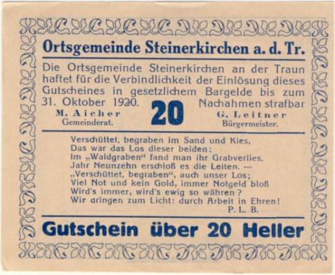 During and after the First World War, money, especially small change, was in short supply. Metal was being used in the war efforts and people's natural tendancy to hold onto something of value, (ie) coins and banknotes, furthered the shortage. Eventually to get over this problem, the state bank (Reichbank) appears to have agreed to allow towns, villages and municipalities to issue their own money. These issues were emergency issues. The word "not" means emergency or necessity and "geld" means money, hence - Notgeld.
