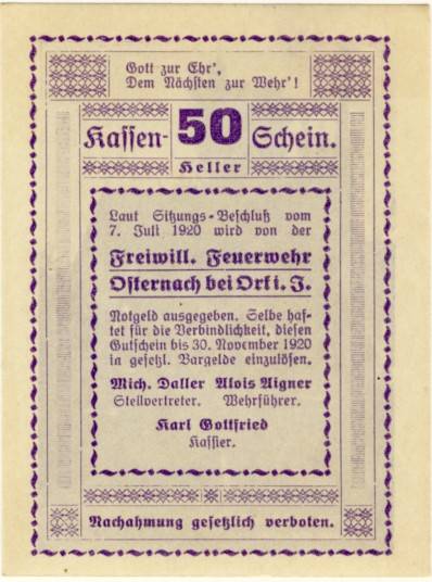 During and after the First World War, money, especially small change, was in short supply. Metal was being used in the war efforts and people's natural tendancy to hold onto something of value, (ie) coins and banknotes, furthered the shortage. Eventually to get over this problem, the state bank (Reichbank) appears to have agreed to allow towns, villages and municipalities to issue their own money. These issues were emergency issues. The word "not" means emergency or necessity and "geld" means money, hence - Notgeld.