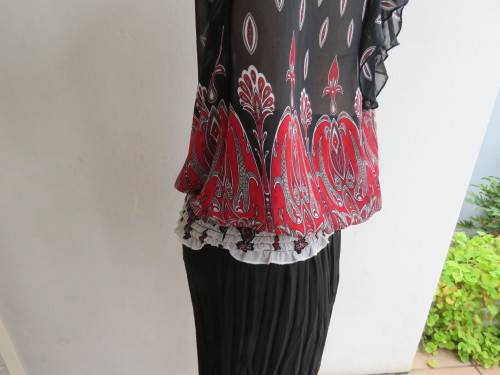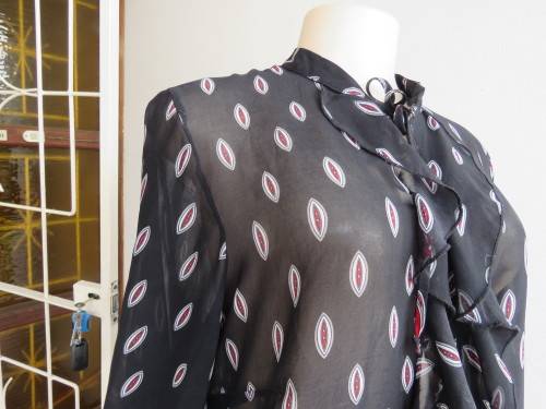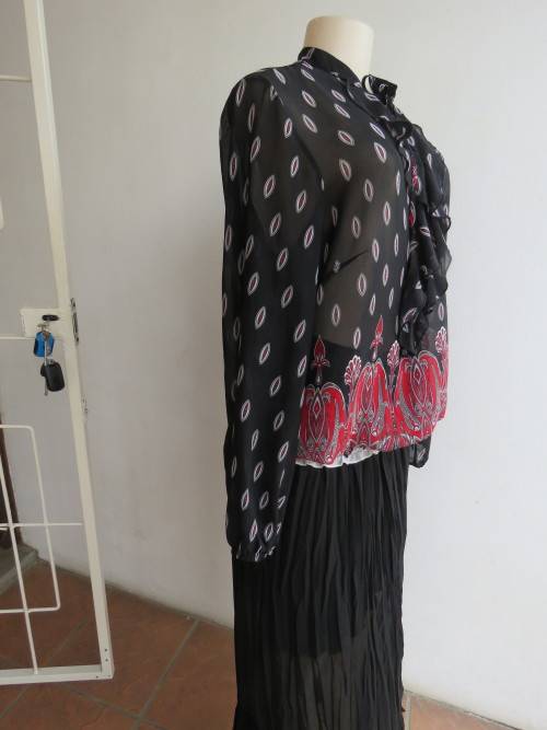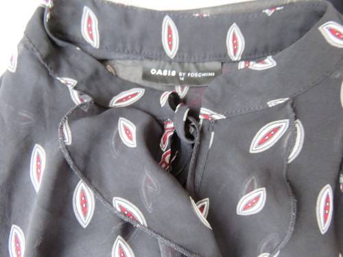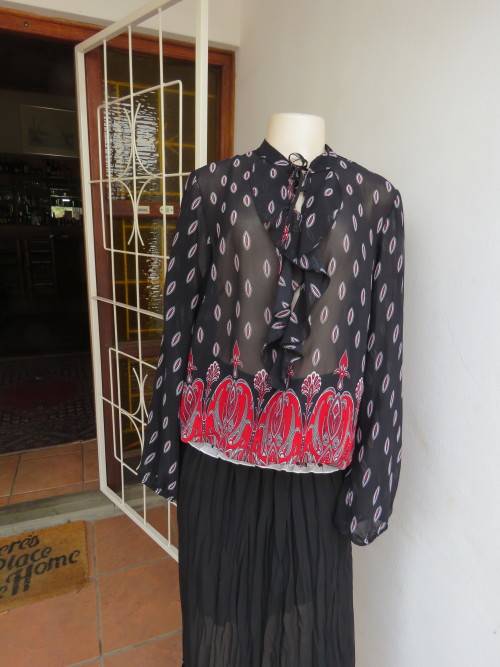 'Notice me' black and red blouson style sheer long sleeve polyester top in 38/14 by 'OASIS'.Baroque print design on bottom part.Wide elasticated seam.High banded neckline with frilled opening and tiestring.Elasticated sleeve cuffs.Good condition.