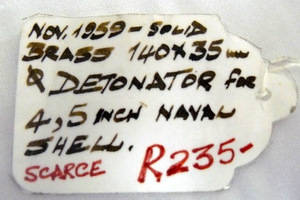 On offer this scarce Solid Brass Detonator for a 4.5 inch naval shell. It stands 13.5cm tall and has a base diameter of 3.5cm. It comes ex-stock of a highly respected Antique Store in DBN that had to close last year due to the ill health of it's owner, posted below the retail tag.