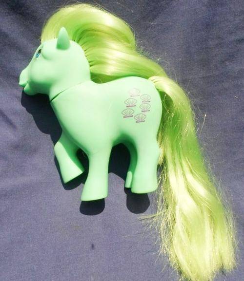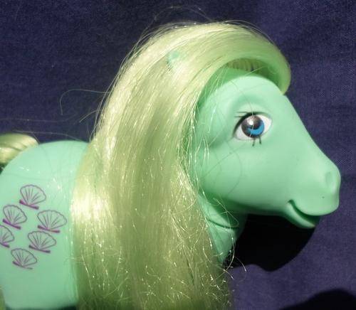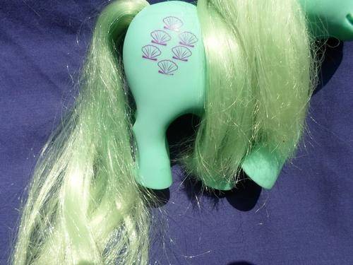 13CM TALL, GREENY TURQUOISE WITH GREENY YELLOW HAIR , BLUE EYES AND PURPLE CLAM SHELL SYMBOLS. I HAVE SEARCHED AND SEARCHED ON THE INTERNET BUT CAN'T FIND ANOTHER LIKE IT (OR EVEN A DESCRIPTION) YET IT IS MARKED "HONG KONG" UNDER ONE FOOT AND "83 HASBRO PAT. PEND." UNDER THE OTHER (LIKE SOME OF THE OTHER EARLIER ONES) PLEASE CORRECT ME IF I AM WRONG (AS I'M NOT A FUNDI) BUT I THINK THIS LITTLE PONY IS A FIND!!! POSTAGE R35. REFER IMAGES