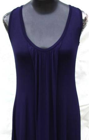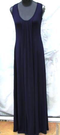Round neck with wide binding. Gathers off front middle of neck. Side body style-line meeting with back style line. Gathers off back style-line. Easy fit dress, floor length.