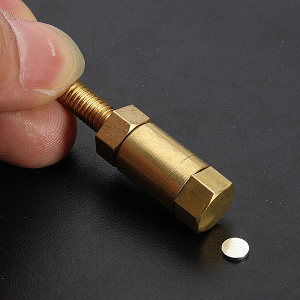 Magician first demonstrates a bolt and a nut to audiences . Then he randomly choose one of them, and asks the person to fasten the nut onto the bolt a few rounds . The magician then holds the bolt by two fingers wearing short sleeves, and it's time for the magic to happen. The magician puts a spell on the device and the nut gradually moves on its own, no interference by the magician, then spins off from the bolt. The magician passes the separate pieces to the audience for inspection. They look just like any ordinary bolt and nut . You can perform the trick in any condition without practicing any skills.