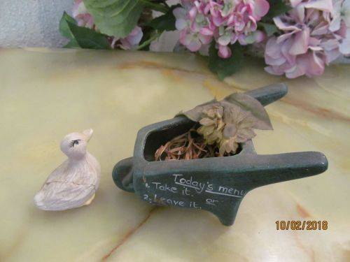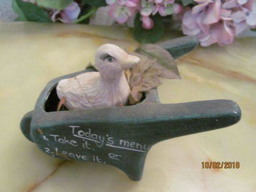 2)- A WHITE DUCK AND WHEELBARROW FIGURINE MANUFACTURED FROM BISQUE CERAMIC. THE DUCK CAN BE REMOVED FROM THE WHEELBARROW. TEXTILE FLOWERS AND LEAVES ARE ATTACHED TO ONE CORNER OF THE WHEELBARROW. ON THE SIDE IS MARKED IN WHITE - "TODAY'S MENU, 1)TAKE IT, OR 2)LEAVE IT. THIS ITEM IS 8cm HEIGHT.....14.8cm LENGTH.....8.5cm HANDLE TO HANDLE