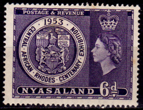 NYASALAND, 1953. The 100th Anniversary of the Birth of Cecil Rhodes Exhibition. Single issue, mint, previously hinged. Hinge remains on back. Toning front and back. View scans for condition as it form part of the description, CV +/-R 5.00. Note, display card not included, and, the lines across the images are due to the display card that we use to scan items.