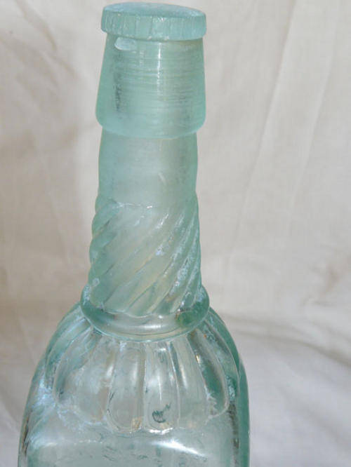 A very interesting cordial bottle from O.T. Ltd of Australia. The company was registered in Victoria, Australia, in July 1909 and this bottle, dug in Pretoria, would date from the early 1900s. The bottle is 30cm high with its glass stopper. It has a lovely embossing of what appear to be chillis, suggesting it was a fairly "hot" cordial! It has an intricate patterned and twirled neck and some lovely air bubbles in the glass. All in all a very handsome bottle and a good addition to any collection, especially of mineral and cordial bottles.