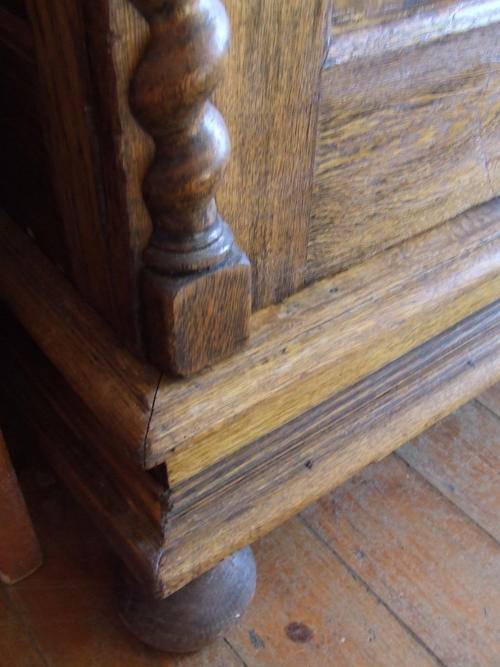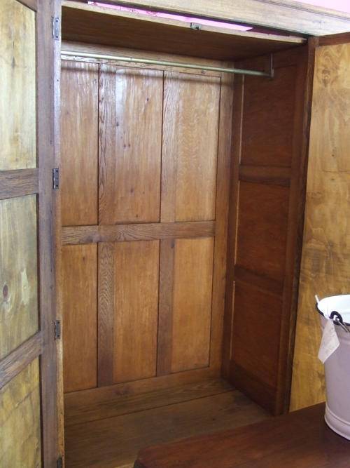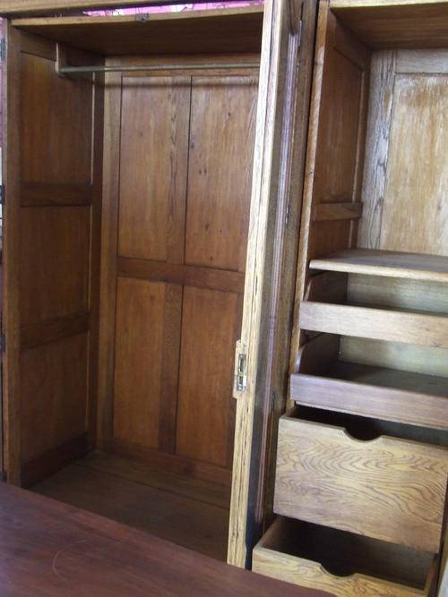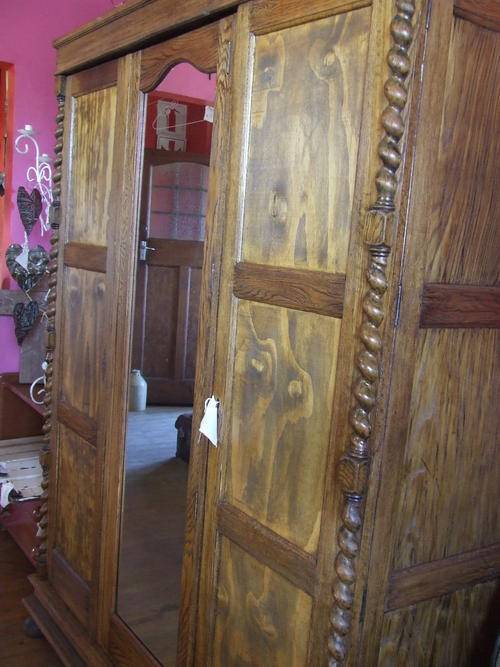 gorgeous 3 door oak wardrobe. double hanging rail on left hand side. single drawer and shelf space ontight. door panels and mirror replaced. still needs handles and locks. wardrobe separates into 4 pieces. 1530 wide x 2m high x 600 deep.