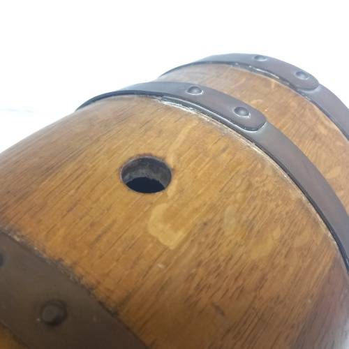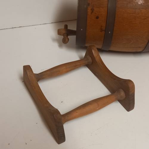 This beautiful oak barrel with brass rings is in nice condition and comes with a stand.